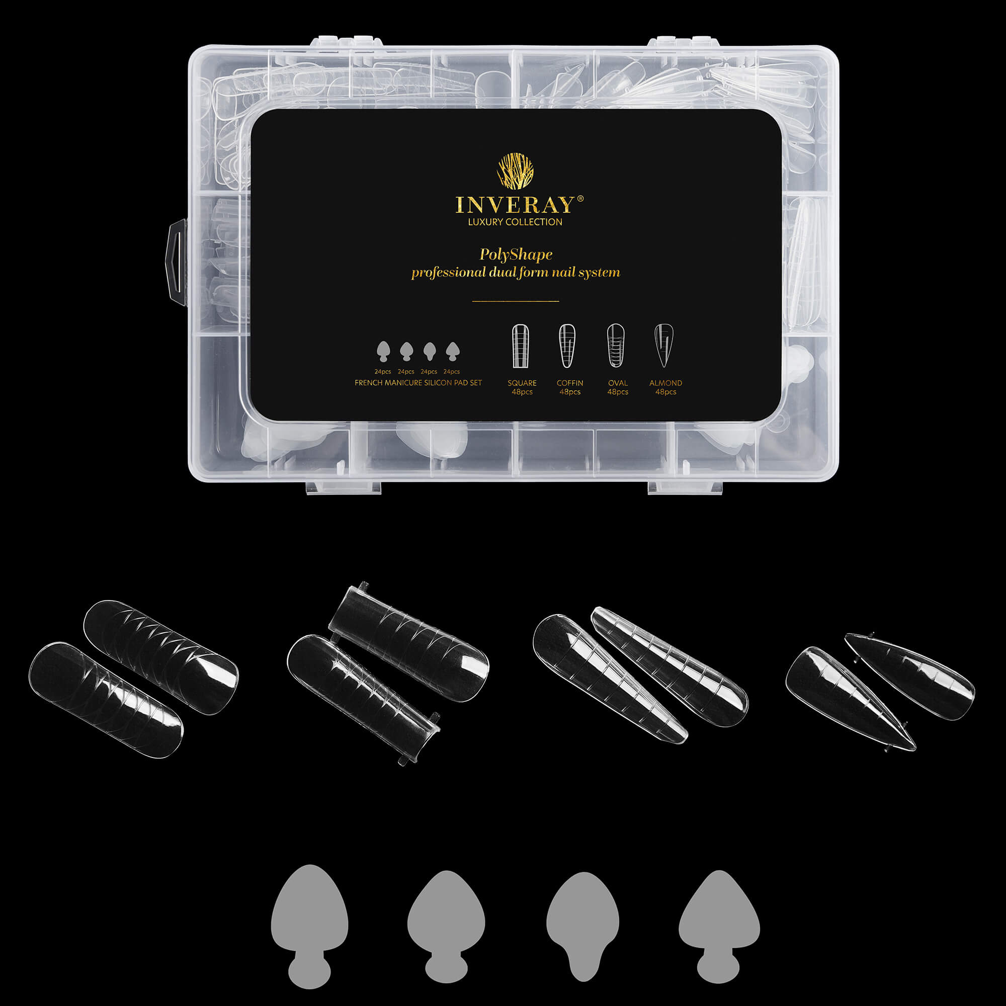 PolyShape doskonale współpracuje zarówno z górnymi formami Inveray. Jego odpowiednio gęsta, niesamopoziomująca konsystencja zapewnia pełną kontrolę nad aplikacją, co ułatwia przedłużanie wszystkich paznokci jednocześnie. PolyShape, jak i dolnymi formami papierowymi, co daje swobodę wyboru techniki pracy. Wykorzystując dedykowany pędzelek oraz płyn PolyShape, uzyskanie odpowiedniego kształtu przedłużanego paznokcia staje się efektywne i szybkie.