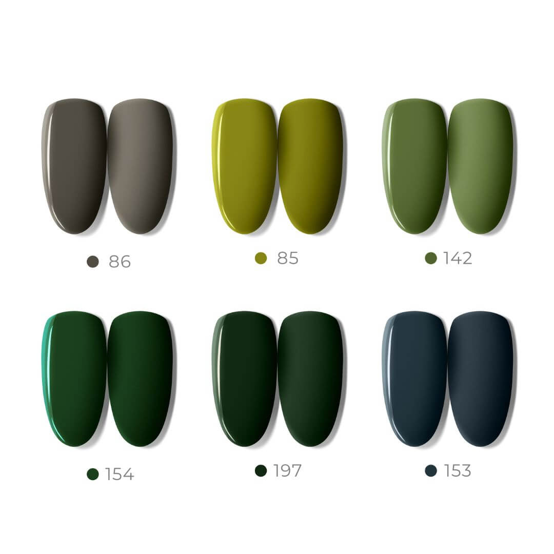 • Zieleń jest kojarzona z naturą i spokojem. Kolor zielony działa kołąco i pomaga w zrelaksowaniu się. Odcienie zieleni oferowane przez INVERAY pozwalają stworzyć manicure przywodzący na myśl harmonię i witalność natury.187,  186,  142