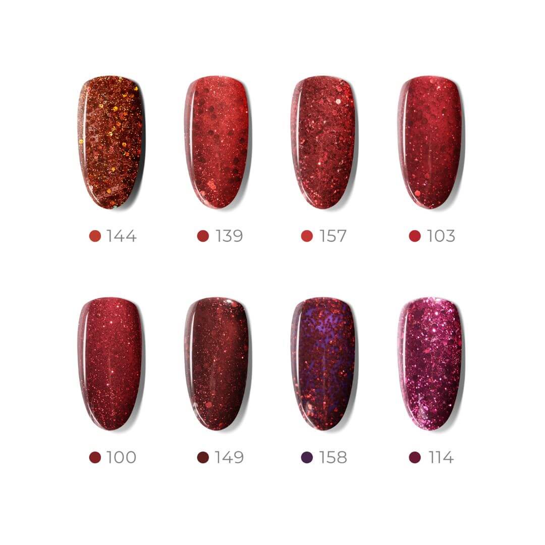 - Czerwony brokatowy lakier hybrydowy w kilku odcieniach: 149, 157, 158